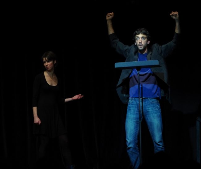 D’abord deux pupitres. Ces objets utilisés par les musiciens de fanfare pour poser les partitions ou par les politiciens qui ne savent pas encore que les prompteurs existent. Et puis des comédiens. Deux (ou trois). Et derrière tout ça, un livre, signé Arnaud Dudek, qui raconte l’histoire pas très marrante mais drôle tout de même de Martin Leroy, un homme de 25 ans qui perd en une journée ce qui faisait sa vie, sa copine et son boulot. Pas content, le Martin va tenter de reconstruire tout ça à coups de marteau. On n’en dira pas plus…